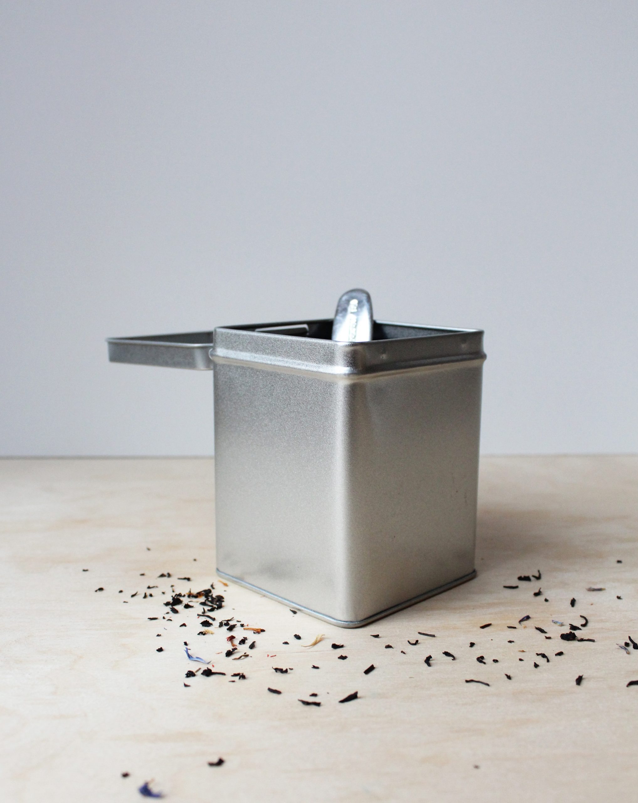 Vierkant blikje voor 100 gram thee, met scharnierdeksel. Hierin kun je gemakkelijk je losse thee bewaren.