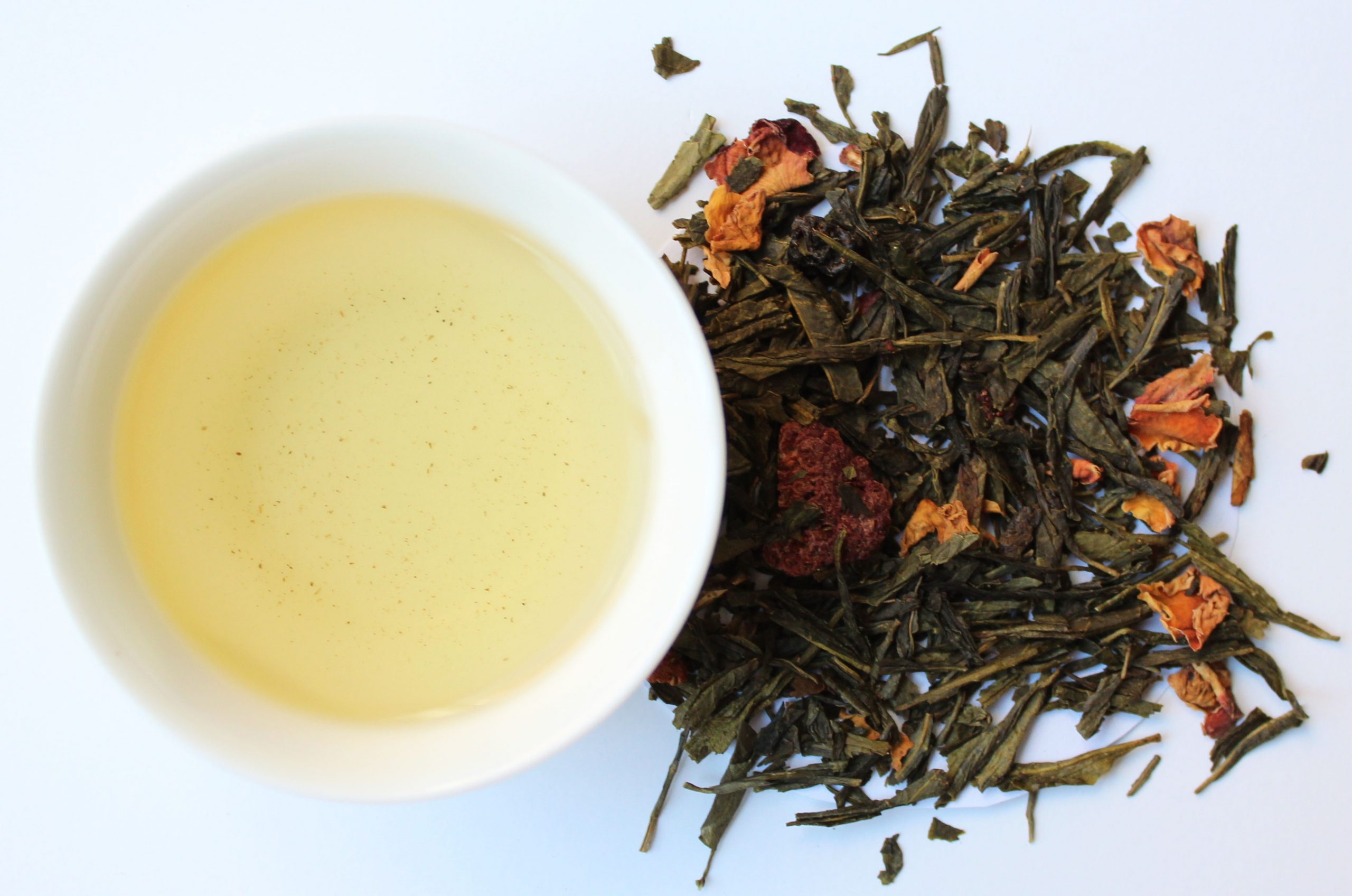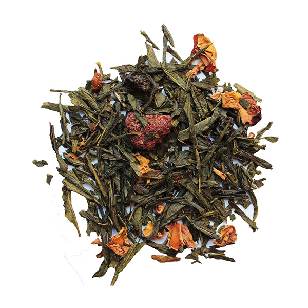 Groene thee 72%, Krenten, Rozenblaadjes, Aroma’s, Aardbei, Papaya, Ananas, Framboos, (Suiker)