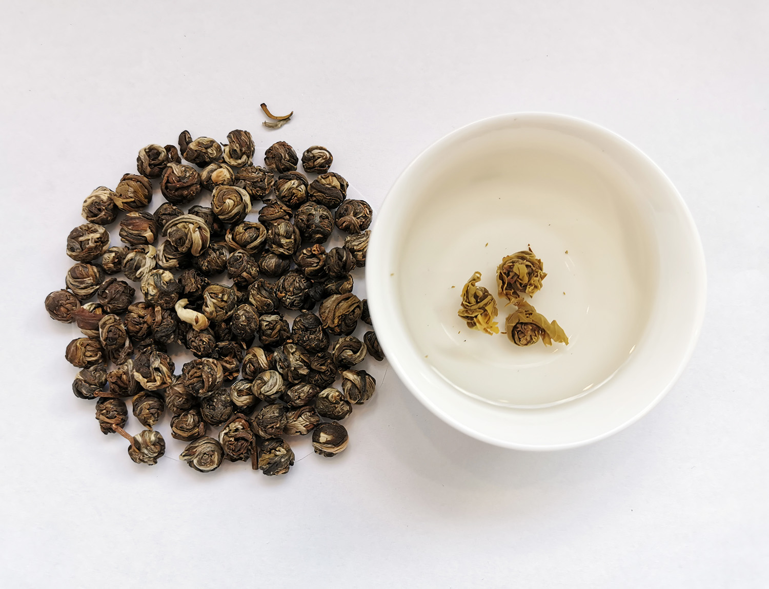 De groene thee wordt tijdens het droogproces tot zesmaal toe vermengt met geurige jasmijnbloesem. En vervolgens met de hand gerold tot prachtige jasmijn parels. Deze bijzondere thee heeft een fijn, bloemige aroma.