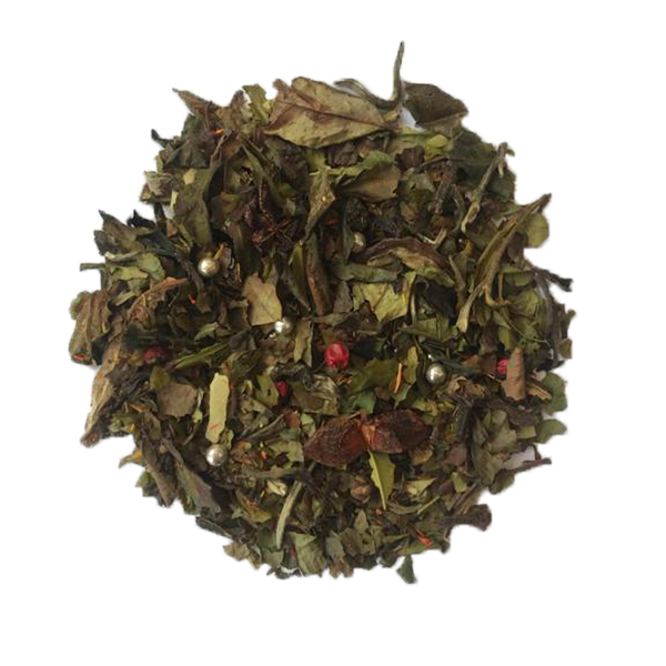 Witte Thee (63%), Zilversuiker Parels, Steranijs, Kaneel, Kruidnagel, Amandelschilfers, Krenten, Saffloerblaadjes, Roze Peperkorrels, Natuurlijk Aroma