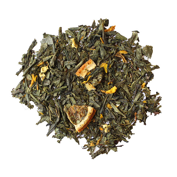 Groene thee, Sinaasappelpartjes, Sinaasappel granulaat, Citroengranulaat, Gesuikerde abrikozen, Zonnebloembloesem, Natuurlijk aroma.