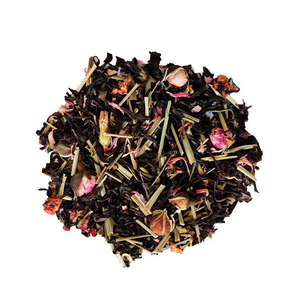 Zwarte Thee (76%), Citroengras, Rode Rozenknopjes, Aroma, Stukjes Aardbei Gevriesdroogd, Rode Korenbloemblaadjes.