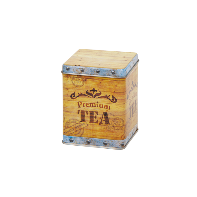 Vierkant blikje voor 100 gram thee, met scharnierdeksel. Hierin kun je gemakkelijk je losse thee bewaren.