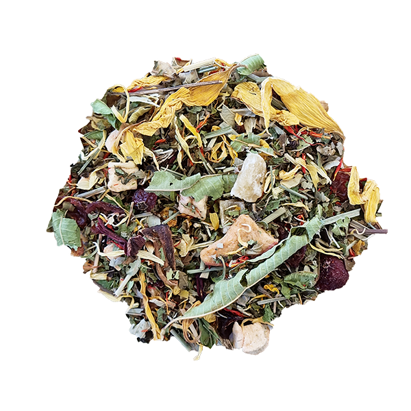 Appel, Vlierbessen, Johannespitbrood, Rozenbottelschil, Hibiscus, Ananas, Kokosnoot chips, Natuurlijke Aroma, Kiwi, Damiana blad, Cranberry, Moringa Blad, Appel Mint.